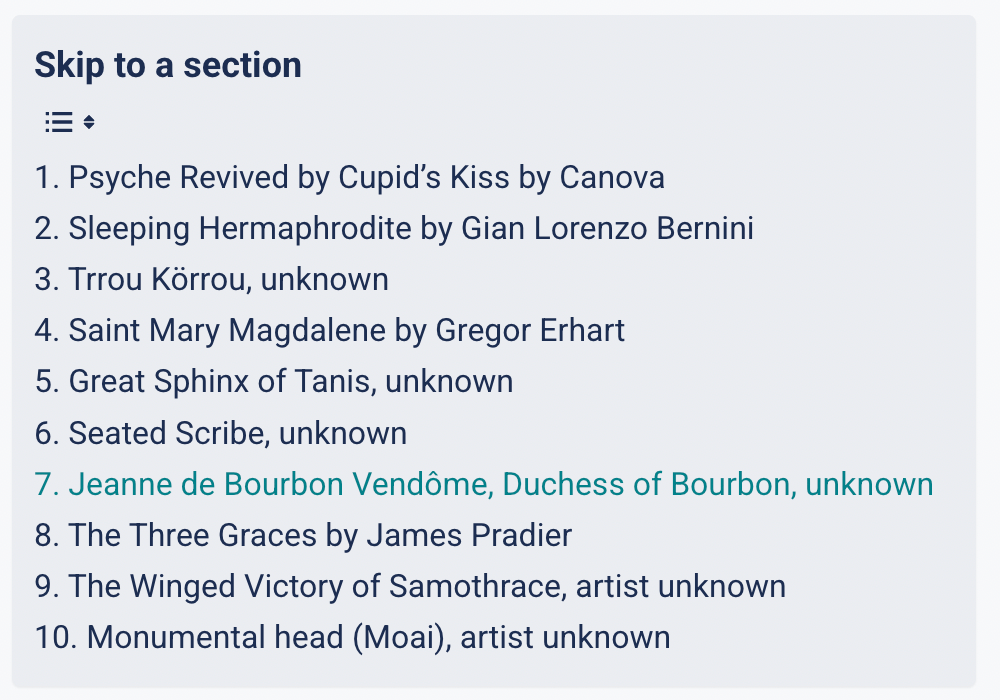 - Established “Louvre sculptures and statues” as the primary keyword, and embedded it in the title, metatitle, metadescription, image alt text, and first paragraph