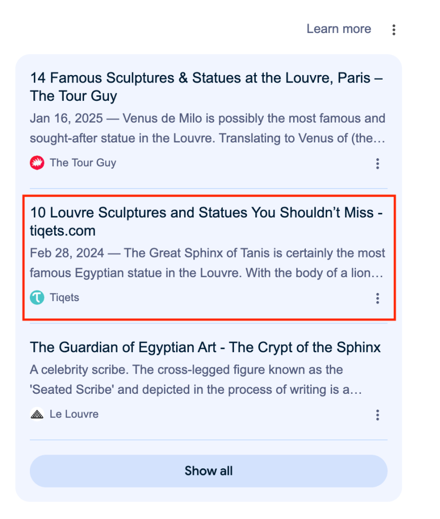 The blog post is at the second postion on the Google SERP, for the keyword, “Louvre sculptures and statues,” right after the dominant domain, the Louvre
