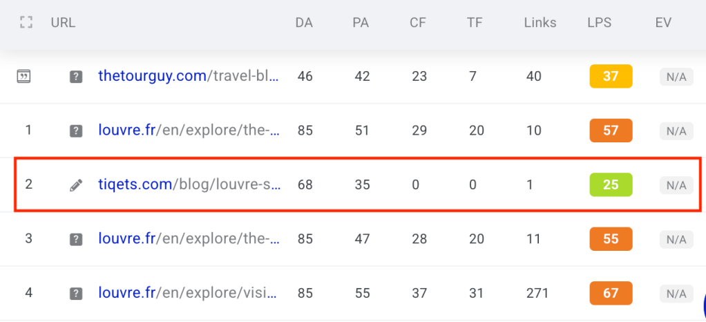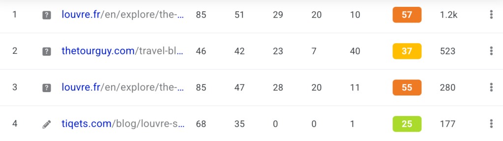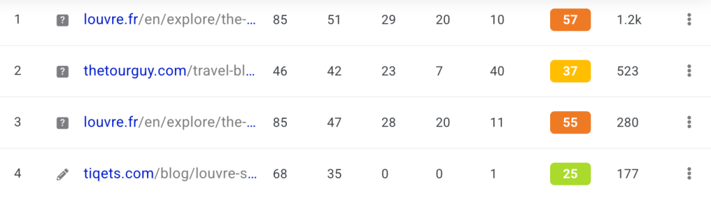 - Established secondary keywords “Louvre sculpture” (31 difficulty/3000 volume), “Most famous artworks in the Louvre” (28/1700), “Cupid and psyche sculpture louvre” (26/14700)